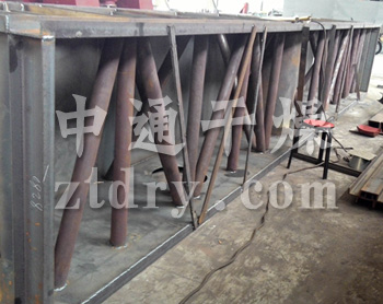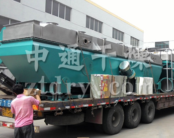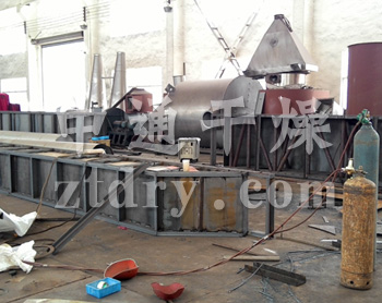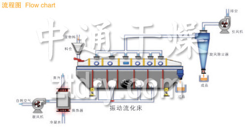 物料自进料口进入机内, 在振动力作用下, 物料沿水平方向抛掷向前连续运动,热风向上穿过流化床同湿料换热后, 湿空气经旋风分离器除尘后由排风口排出, 干燥物料由排料口排出。