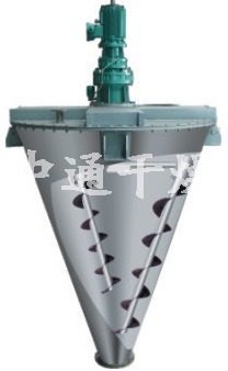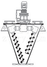 由螺旋的公 、自转使物料在锥体内产生复合运动,主要产生四种运动形式: 1. 螺旋沿壁公转,使物料沿锥壁作圆周运动; 2. 螺旋自转使物料自锥底沿螺旋上升; 3. 螺旋的公 、自转复合运动使一部分物料被吸收到螺旋圆柱面内同时受螺旋自转的离心力作用使螺旋圆柱面内的一部分物料向锥体径向排放; 4. 上升的物料受自身重力作用下降 。四种运动在混合机内产生对流、剪切 、扩散、从而达到快速均匀混合的目的。