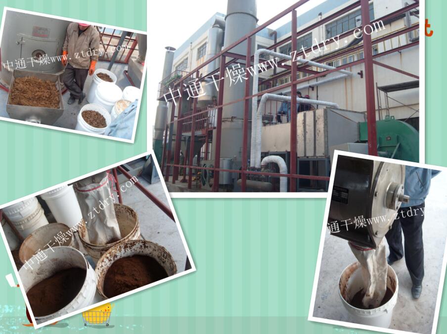 该设备采用蒸汽加热,双螺旋加料器,长锥体旋风分离器收料,脉冲式布袋除尘,自动控温。螺旋加料器和主电机变频调速,加料器与排风温度连锁。下图为现场试生产图片: