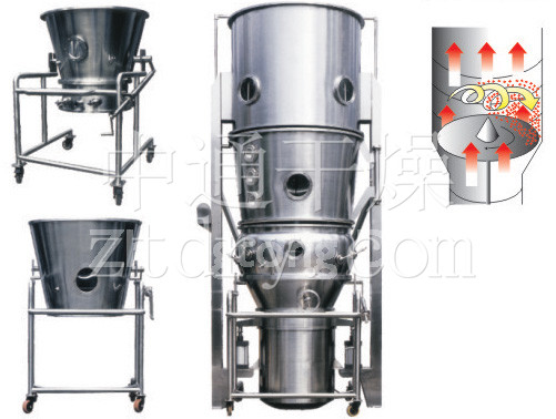 Powder or seed granule in rotated fluid will undertaken the action of air floading force in ring gap, rotating centrifugal force and gravity itself and appear cycle rope strain shape. Adhesive or coat liquid will be sprayed Into the layer of material to form pellet with high degree of ball or continuous and uniform coating film.